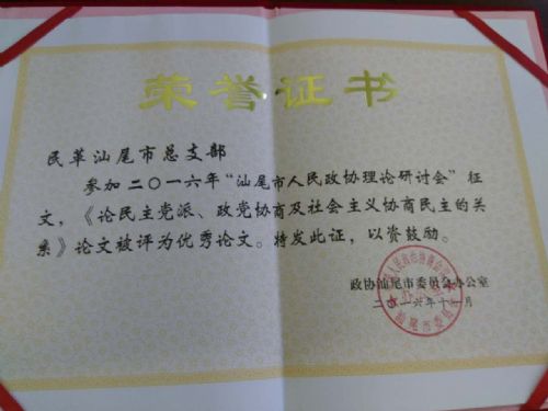 民革汕尾市总支部参加2016年“汕尾市人民政协理论研讨会”征文。提交的论文《论民主党派、政党协商及社会主义协商民主的关系》被评为优秀论文,受到大会表彰,并被大会指定发言。这充分肯定了民革汕尾总支的政治理论水平和参政议政能力。(黄晓丹)