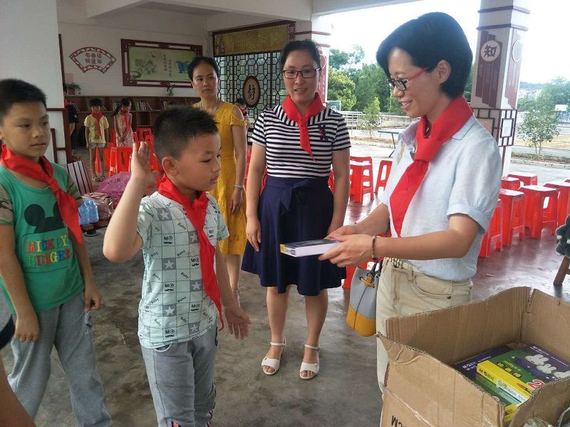 随后,民革党员一行来到六祖镇船岗小学,为44名留守儿童送上牛奶、文具用品等慰问礼品,