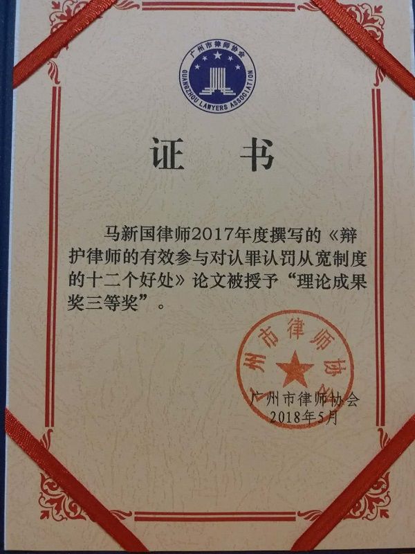 民革广州天河区基层委员会党员马新国律师2017年度撰写的《辩护律师的有效参与对认罪认罚从宽制度的十二个好处》论文,近日被广州市律师学会授予“理论成果奖三等奖”。
